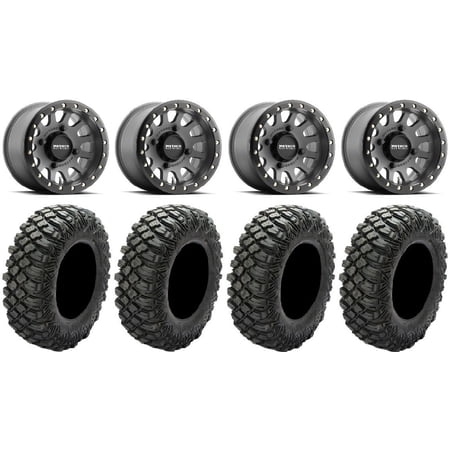 This Wheel and Tire Kit Includes: (4) KMC KS235 Grenade Beadlock 14×7 ATV/UTV Wheels – Satin Black (4/156) +10mm [KS23547044710] (4) System 3 XTR370 (8ply) Radial ATV/UTV Tires [30×10-14] (1) Gorilla 12mm x 1.25 Lug Kit & Valve Stems – Chrome [K4CS-12125GR] (4) Tires Mount on ATV/UTV Beadlock Wheels These Wheels will fit the following machines: Kawasaki: Mule PRODX (2016-2022) Mule PRODXT (2016-2023) Mule PROFX (2016-2023) Mule PROFXR (2018-2023) Mule PROFXT (2015-2023) Mule PROMX (2019-2023) Yamaha: Wolverine RMAX2 1000 (2021-2023) Wolverine RMAX4 1000 (2021-2023) YXZ1000R (2019-2023) FITMENT NOTES: If you have any questions or concerns about fitment please contact us by email or phone BEFORE you order. This listing is for these machine models with a 4×156 Bolt Pattern and 12mmx1.25 Lug kit. Tire clearance varies by specific machine. Most machines can go at least 1 larger on the tire diameter. Fitment for other machines is available – Browse our wheel and tire kits for UTVs and ATVs. GENERAL NOTES: When you buy a set of 4 wheels OR 4 wheels & tires from us we include a Chrome Lug Kit at no additional charge ($32 Savings). Beware of other companies that do not include lug nuts & valve stems with their wheel sale some wheels require a special type of lug nut to fit into the wheel and your stock lug nuts may not work. If you wish to substitute the Chrome Lug Kit with a Black Lug Kit please contact us prior to ordering to verify availability and to ensure the change is made before the product has been packaged/shipped. We stock the majority of what we sell to ensure you get a great price and your order is shipped in a timely fashion. If you are interested in a mounted setup and don t see what you are looking for on our store please let us know. We can always package any tire we offer on any wheel we offer and they will come to your door mounted and ready to bolt on to your machine.