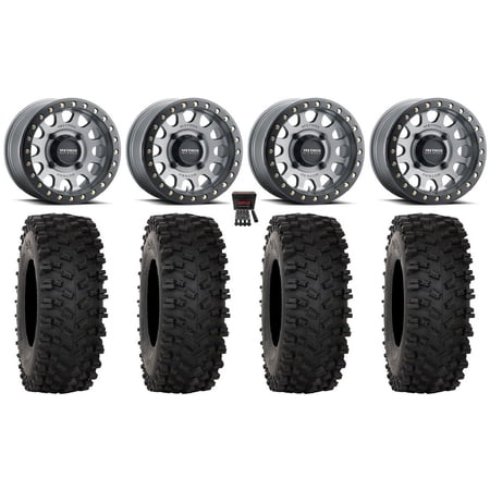 This Wheel and Tire Kit Includes: (4) Method 409 15×7 ATV/UTV Wheels – Steel Grey (4/156) 4+3 [MR40957046443] (4) Pro Armor Crawler XG (8ply) Radial ATV Tires [35×10.5-15] (1) Gorilla 12mm x 1.25 Lug Kit & Valve Stems – Chrome [K4CS-12125GR] (4) Tires Mount on ATV/UTV Wheels These Wheels will fit the following machines: Kawasaki: Mule PRODX (2016-2022) Mule PRODXT (2016-2023) Mule PROFX (2016-2023) Mule PROFXR (2018-2023) Mule PROFXT (2015-2023) Mule PROMX (2019-2023) Yamaha: Wolverine RMAX2 1000 (2021-2023) Wolverine RMAX4 1000 (2021-2023) YXZ1000R (2019-2023) FITMENT NOTES: If you have any questions or concerns about fitment please contact us by email or phone BEFORE you order. This listing is for these machine models with a 4×156 Bolt Pattern and 12mmx1.25 Lug kit. Tire clearance varies by specific machine. Most machines can go at least 1 larger on the tire diameter. Fitment for other machines is available – Browse our wheel and tire kits for UTVs and ATVs. GENERAL NOTES: When you buy a set of 4 wheels OR 4 wheels & tires from us we include a Chrome Lug Kit at no additional charge ($32 Savings). Beware of other companies that do not include lug nuts & valve stems with their wheel sale some wheels require a special type of lug nut to fit into the wheel and your stock lug nuts may not work. If you wish to substitute the Chrome Lug Kit with a Black Lug Kit please contact us prior to ordering to verify availability and to ensure the change is made before the product has been packaged/shipped. We stock the majority of what we sell to ensure you get a great price and your order is shipped in a timely fashion. If you are interested in a mounted setup and don t see what you are looking for on our store please let us know. We can always package any tire we offer on any wheel we offer and they will come to your door mounted and ready to bolt on to your machine.